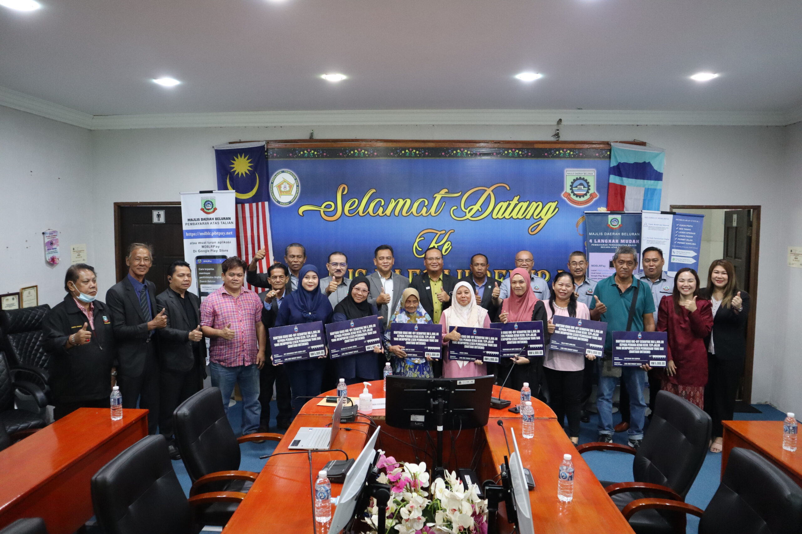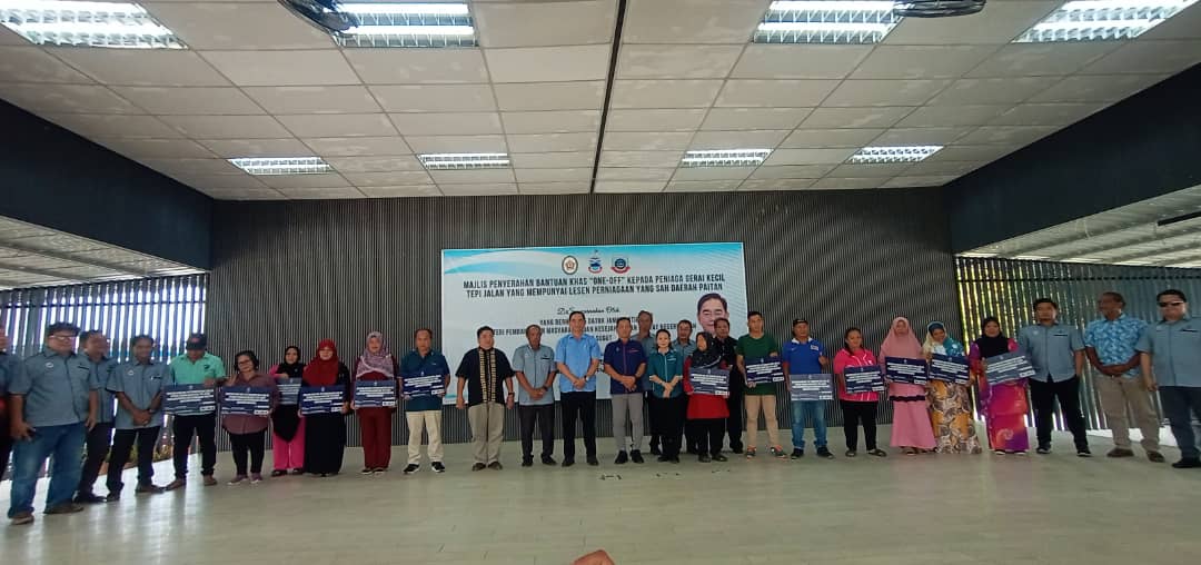 This ceremony was officiated by PPM Tuan Rafael This ceremony was officiated by PPM Mr. Rafael Lindan, representing YB Samad bin Jambri @ Jamri, Assistant Minister of Rural Development Sabah and State Assemblyman for N49 Labuk, to present the special "one-off" assistance to roadside stall traders in the Beluran District. The event was also attended by Beluran District Officer Mr. Roger Appolonius, who also serves as the Chairman of the Beluran District Council, Executive Officer Mr. Huil Benua @ Binua, and Council Members. A total of 11 small roadside stall traders from Beluran District and 12 from Paitan District received this special aid.